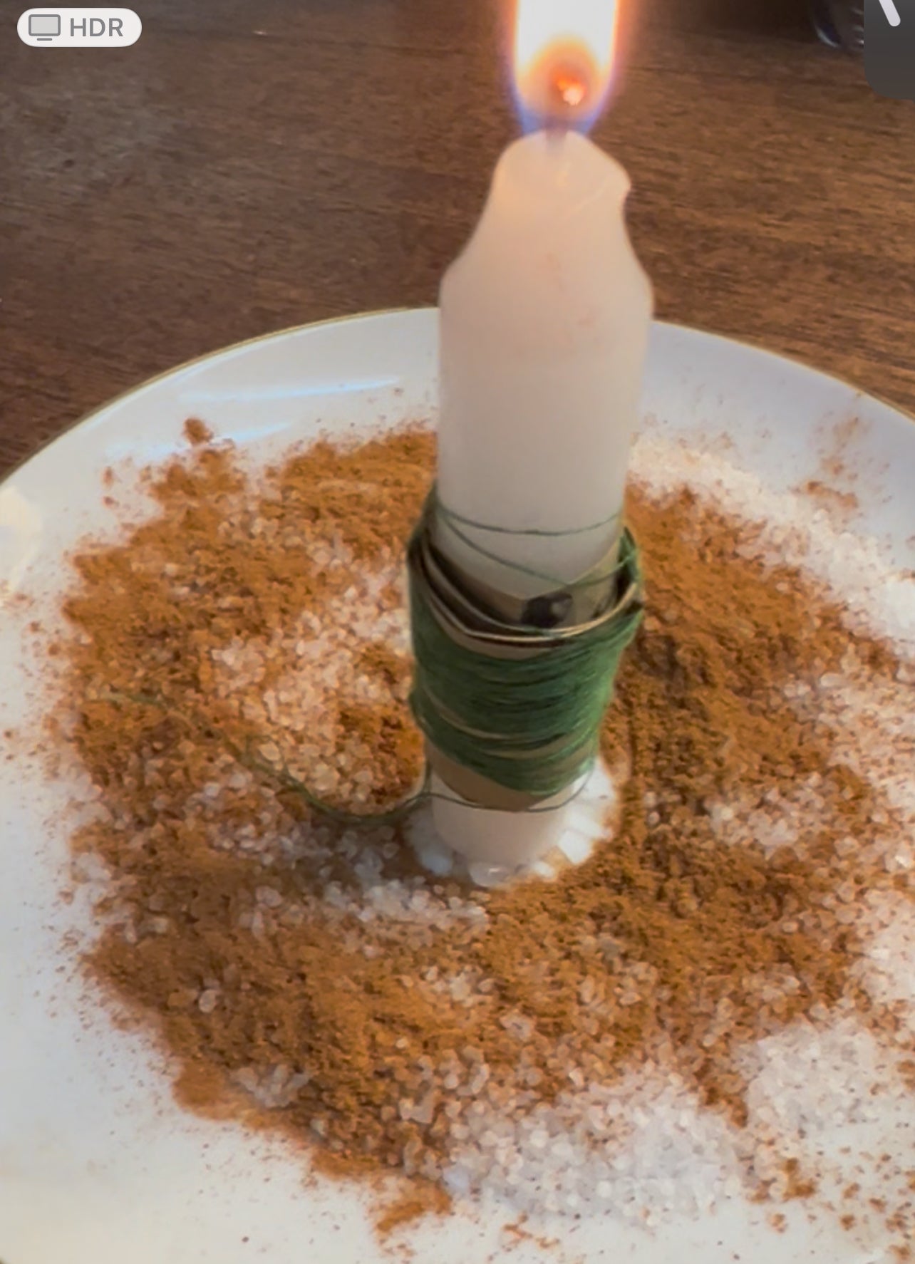 Each candle comes with 3 bay leaves printed with whatever manifestations that you want on them. Includes cinnamon and sea salt to sprinkle around the candles, 3 small candles wrapped with the bay leaves ready to burn.